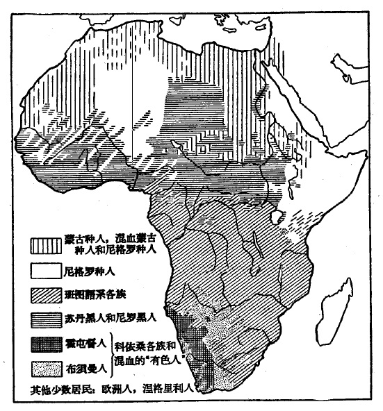 在非洲,曾经发生而且正在发生所有人种的混血现象,但是,这是同下述总前提相符的:正如欧洲主要是欧罗巴种民族的地方,亚洲主要是蒙古种人的地方一样,非洲主要是黑人和尼格罗种民族的地方。我们可以随便丢开划分种族界限的企图,但是,假如有健全的头脑,我们就决不能把全世界的人类划分成白、黄、黑三种,然后又把黑人称为白人。