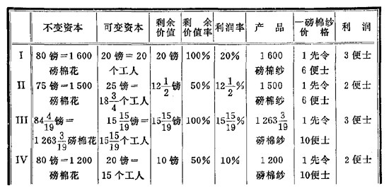 | 不变资本 | 可变资本 | 剩余价值 | 剩余价值率 | 利润率 | 产 品 | 一磅棉纱价格 | |