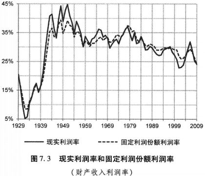 前面所考察的数据具有几个重要的含义。首先,尽管利润率自1980年代早期以后未能恢复这一观点,与我们所设想的自那以后利润份额上升似乎是矛盾的,但是一旦我们了解到利润份额是固定不变的,这个矛盾就消失了。其次,相对固定的利润份额意味着,利润率的下降主要不是一个分配现象。图7.3有助于澄清这一事实。如果在1929至2007年整个时期中财产收入始终占净增加值的一个固定的百分比,那么,这种情况下的利润率就是固定利润份额的利润率。[5]固定利润份额的利润率的变动与现实利润率的变动非常近似,这是因为现实利润份额实际上始终是相对固定的。