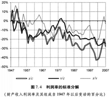图7.4还表明,在1947至1968年间,以及1970至2003年间,剩余价值率都只有极小的变化。这意味着,利润率在这两个子时期中的几乎所有下降,也可以归因于资本价值构成的上升。
