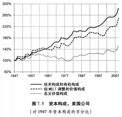 在最近60年中,资本的技术构成和有机构成几乎一直在颇为迅速地上升。它们在1947至2009年间的年均增长率为1.7%。总的来说,经MELT调整的价值构成紧密地跟随着技术构成和有机构成,并且它上升得几乎也一样快,平均每年上升1.5%。相反,资本的名义价值构成增长慢得多。它在1961至1999年间总共增长不到0.1%。