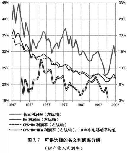 由于利润份额和MELT的变化对利润率几乎没有影响,因此几乎全部名义利润率的下降都可以被归结为,在我们保持利润份额不变并且也对MELT的变化进行了调整之后所得到的利润率的下降。我将把后面这个利润率称之为固定利润份额的经MELT调整的利润率(CPS-MA利润率)。它是名义利润率在下面这些条件下所呈现的水平:即财产收入在净增加值中所占份额完全保持不变,并且价格没有相对于商品的劳动时间价值上升。如图7.7所示,1947至2004年间,名义利润率、经MELT调整的利润率(MA)以及CPS-MA利润率下降了几乎相同的数量——分别为13.2、13.7和12.4个百分点。因而,在这一时期,CPSMA利润率的下降解释了名义利润率的94%的下降。
