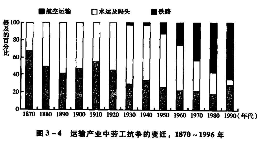 最后,和其他产业相比,国家管制对于运输业劳工抗争动力机制的影响要更为重要和直接。由于运输体系的平稳运转对于资本积累的重要性,再加上运输工人拥有强大的工作场所的谈判力量,而且资本对运输体系进行空间调整的能力非常有限,因此,为了防患于未然,政府对运输工人抗争的介入非常广泛。例如,在很多国家,铁路工人是最早获得合法权益的(如工会的合法化),但与此同时,限制铁路工人活动的法律也得以通过(例如,铁路工人的罢工是非法的)。