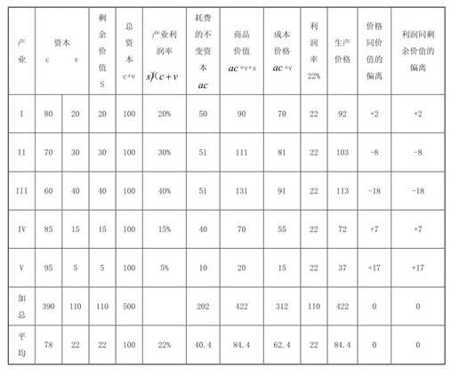 因此,价值向价格的转化同时也是剩余价值向利润的转化。![]() 马克思使用表3.1中的数字例子,清楚地说明了转形问题包含的内容。五个部门分别投资100单位资本,每个部门有不同的资本有机构成和相同的剥削率(e=100%)。无论是生产出的剩余价值总量还是利润率,和资本有机构成之间都是一种反向关系。部门Ⅲ生产的剩余价值最大(有机构成为k=1.50),部门Ⅴ生产的剩余价值最小(有机构成为k=19.00)。相应地,s和(c+v)之间的比率也因此而不同,分别为40%和5%。在五个部门中,不变资本的耐久性是不同的:在部门Ⅲ使用的60单位不变资本中,在一年期生产过程中耗费了51单位,而投资于部门Ⅴ的95单位不变资本中,只有10单位的不变资本转移到年产品中(这或者是因为部门Ⅴ与部门Ⅲ相比,使用了更多的机器和相对较少的原材料,或者是因为部门Ⅴ的机器有更长的使用寿命,或者两者兼而有之)。每个部门的总生产成本,马克思称之为成本价格,由耗费的不变资本和总的可变资本的总和决定,在这里,马克思假定可变资本每年周转一次。利润获得的方式是,马克思对整个经济中使用的总资本作了加总,390c+110v=500;总剩余价值为110,用总剩余价值除以总资本,得到平均利润率:r=110/500=22%。每个部门的资本家获得的是按总资本计算的22%的利润,在这个例子中,即每个部门的利润为22。把这个利润和每个生产部门的成本价格相加,就得到生产价格。三个资本有机构成超过社会平均水平的部门(Ⅰ,Ⅳ,Ⅴ),商品的价格超过了价值,有机构成较小的部门Ⅱ和Ⅲ,价格低于劳动价值。不同部门的利润和剩余价值以一种完全相似的方式发生了偏离。 然而,总的来看,价格和价值是相等的(等于442),同样总利润也等于总剩余价值(等于110)。这两个“不变条件”的重要性在于,它们使得平均利润率可以被定义为两个价值量之间的比率(总剩余价值除以使用的总资本)。马克思推论,一般利润率必须“从商品的价值引申出来,没有这种引申,。马克思认为一般利润率(从而商品的生产价格)就是一个没有意义、没有内容的概念”转形过程存在一个历史的维度。在前资本主义社会的商品生产中,生产者拥有自己的生产资料并相互交换他们的商品,劳动价值成为占统治地位的交换条件。从而“商品按照它们的价值或接近于它们的价值进行的交换,比那种按照它们的生产价格进行的交换,所要求的发展阶段要低得多……把商品价值看作不仅在理论上,而且在历史上先于生产价格,是完全恰当的”马克思设想,利润率通过资本家之间的竞争而均等化,竞争首先在部门内部展开,接着出现在部门之间,一般利润率只有到资本主义较晚的历史阶段才出现。 马克思对这个观点没有作进一步的论述,我们随后将会明白,他不这样做是明智的。除此之外,马克思留下了另一个没有解决的难题: 我们原先假定,一个商品的成本价格,等于该商品生产中所消费的各种商品的价值。但一个商品的生产价格,对它的买者来说,就是成本价格,因而可以作为成本价格加入另一个商品的价格形成。因为生产价格可以偏离商品的价值,所以,一个商品的包含另一个商品的这个生产价格在内的成本价格,也可以高于或低于它的总价值中由加到它里面的生产资料的价值构成的部分。必须记住成本价格这个修正了的意义,因此,必须记住,如果在一个特殊生产部门把商品的成本价格看作和该商品生产中所消费的生产资料的价值相等,那就总可能有误差。对我们现在的研究来说,这一点没有进一步考察的必要。95