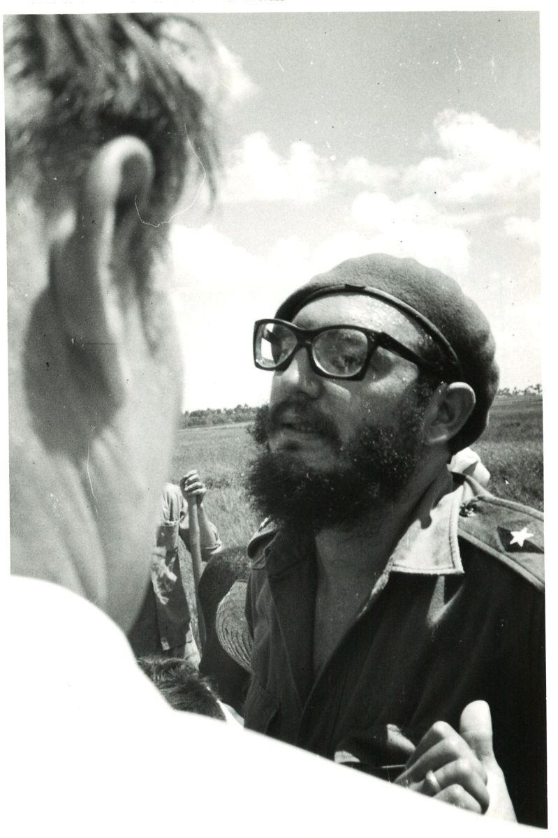 1961年,访问古巴期间,伊文思(背影,左一)与卡斯特罗交谈。
