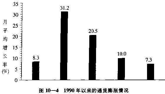 因休克疗法而引致的价格膨胀不仅是比预期的要快,而且遏制其恶化也比预期的要困难得多。1991年以前,苏联经济还只出现轻微的通货膨胀,20世纪80年代苏联消费品价格指数低于2%,1990年为5.6%。[9]图10—4表明了1990年以来的通货膨胀情况。[10]由于1991年中央计划被废除,当年官方允许消费品价格总体上涨160%,或者每个月上涨8.3%;1992年1月几乎所有消费品价格放开以后,当年消费品价格上涨了2500%(每个月上涨了31.2%)。在其后的三年中,通货膨胀逐渐下降,但是在1995年的最后三个月,消费品价格每月仍然上涨了4.1%,即每年上涨63%。[11]