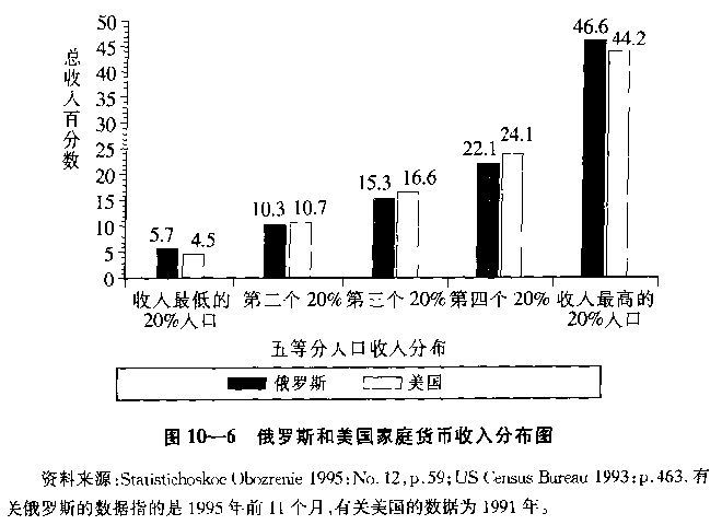 在生活水平急剧下降的大多数人与从休克疗法得到好处的少数人之间收入差距日益扩大。图10—6表明了1995年俄罗斯家庭收入分配情况,该图也列出了美国的收入分配情况,以供比较。该图显示了由最穷的20%的家庭占有总收入的百分比到最富有的20%的家庭占有总收入的百分比。苏联体制产生的是货币收入的相对平均主义分配,仅在资本主义市场体制建立之后的几年中,俄罗斯就大体上形成了与后里根时期相似的收入分配格局。[26]在俄罗斯,收入最高的20%家庭占有总收入的份额比美国收入最高的20%的家庭的占有总收入的份额还要高,收入最低的20%的家庭的收入情况也是如此;俄罗斯处于中间的家庭占有总收入的份额比美国处于中间的家庭占有总收入的份额要低。